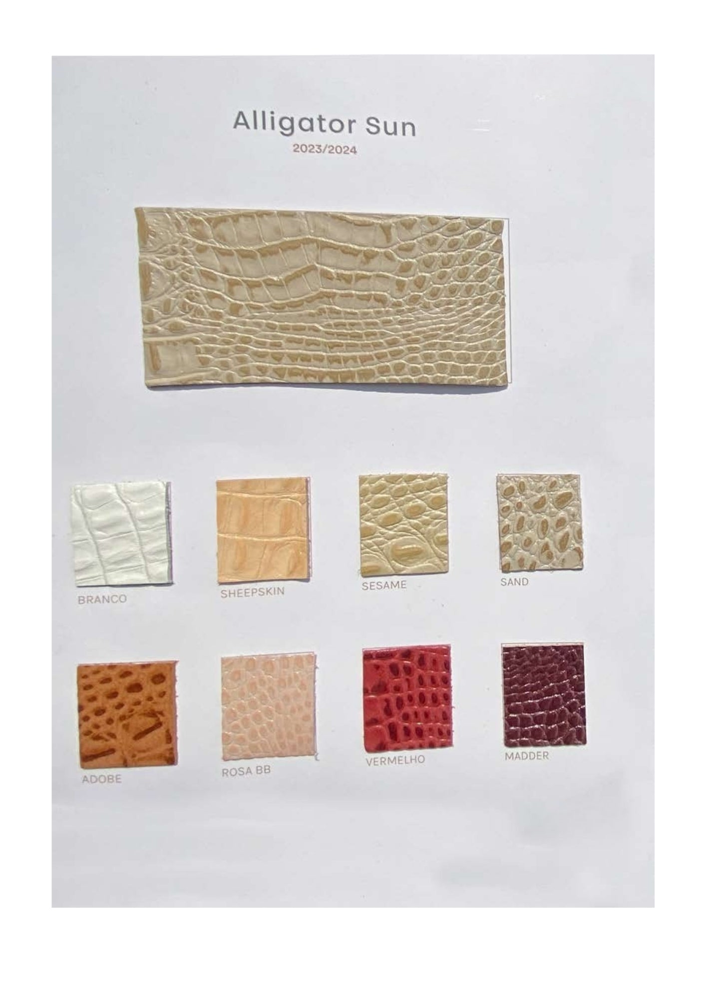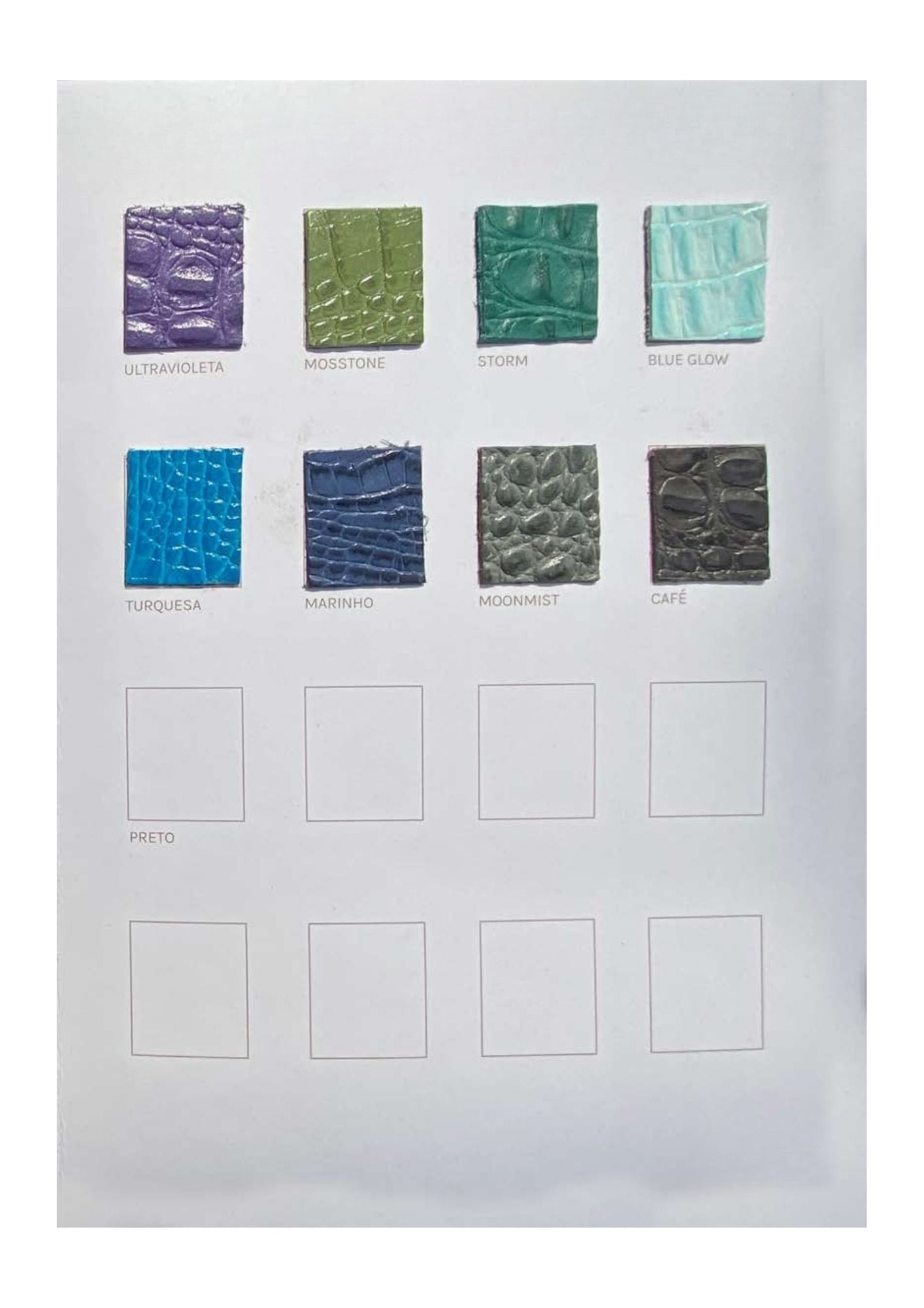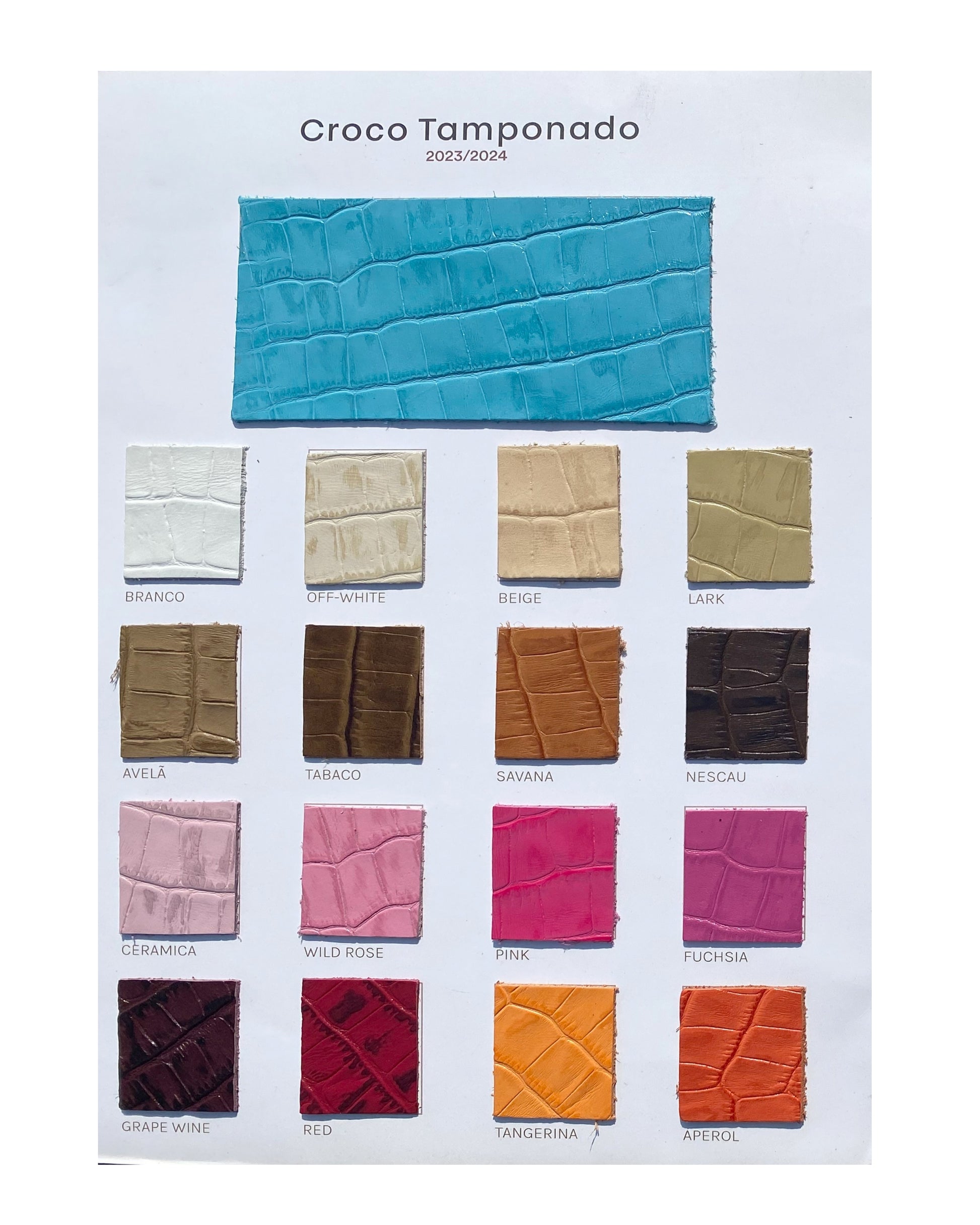 Bolsa em couro, de estrutura rígida e formas retas, confeccionada em croco tamponado ou alligator sun (ver catálogo nas fotos).