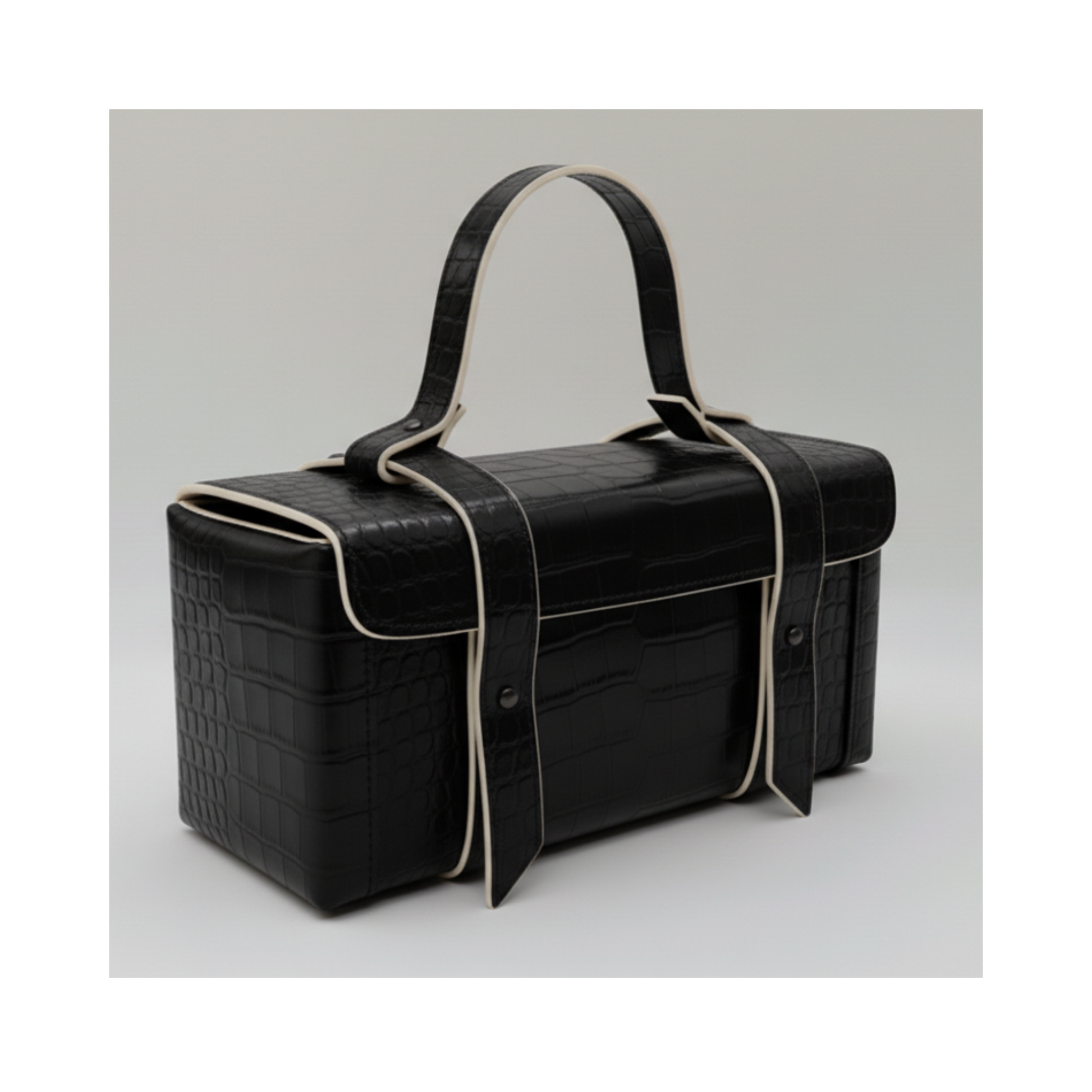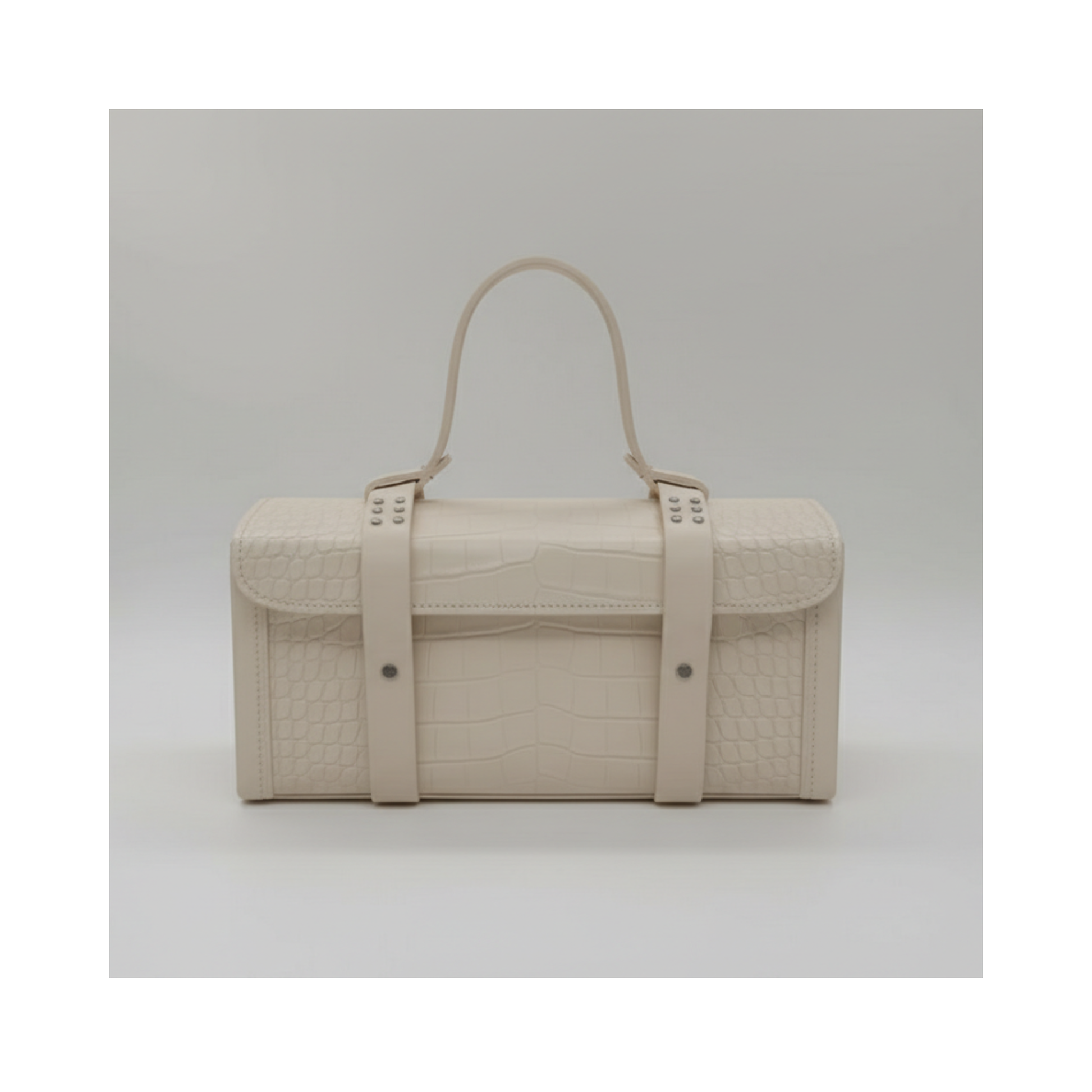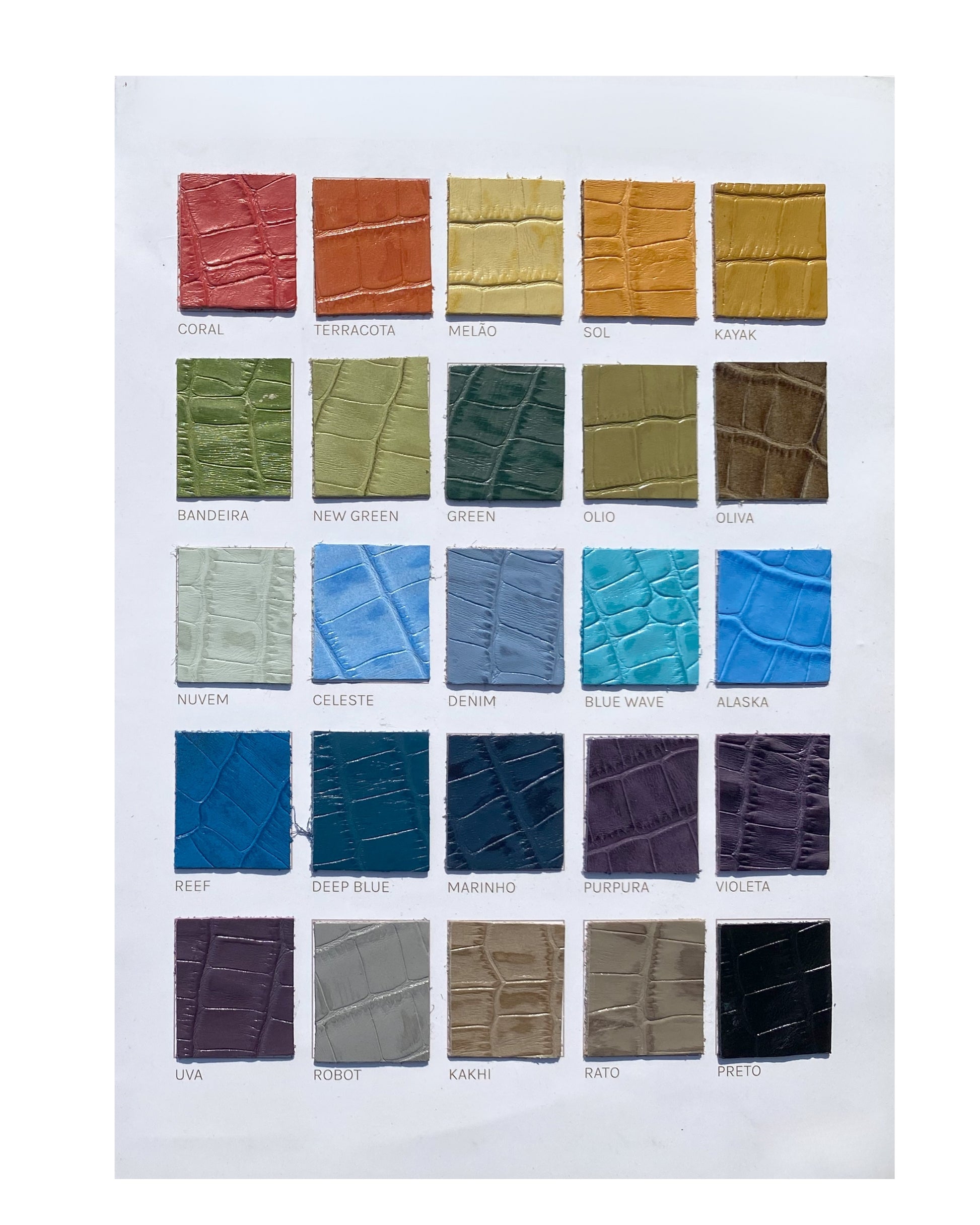 Bolsa em couro, de estrutura rígida e formas retas, confeccionada em croco tamponado ou alligator sun (ver catálogo nas fotos).