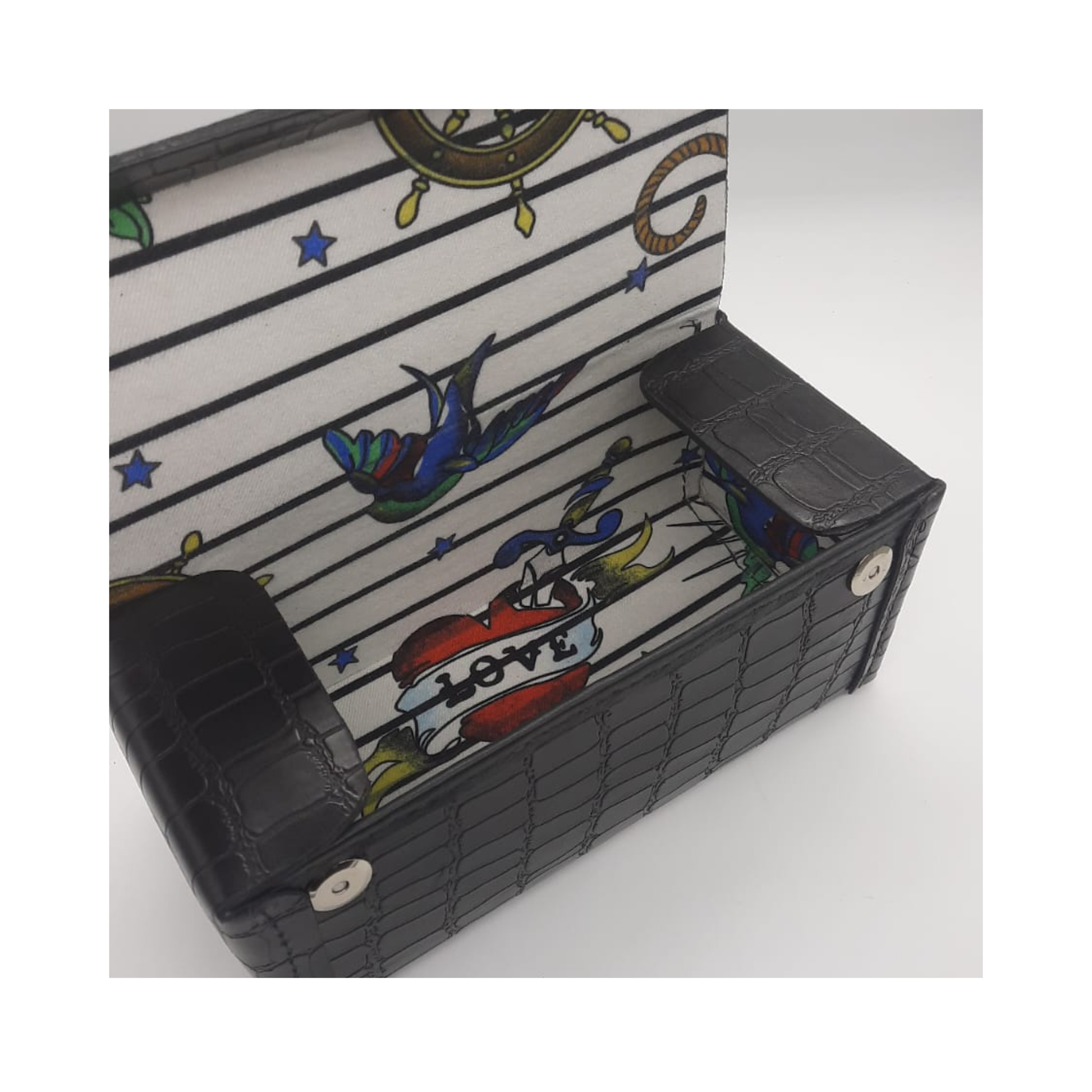 Possui alça fixa de mão em couro soleta, com rebites na parte superior, e interior em lona estampada.